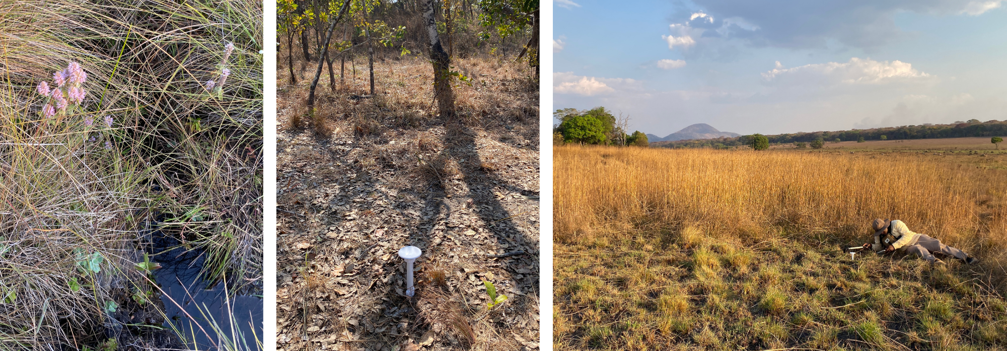 Alongside the vegetation transect, we installed a series of sensors across three miombo/dambo transitions to calibrate microclimate models of waterlogging and frost. Soil moisture and temperature, at ground level and at 10cm deep, will be recorded over the year. We also measured other metrics such as tree cover and grass height, which will influence the localised conditions that the sensors detect. These data will be pooled with comparable transects in Bicuar National Park, Angola, where we sampled last year as part of our project ‘Mapping and Managing Africa’s Grasslands’.