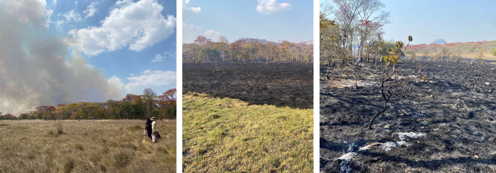 One morning, we had a stark reminder that fire is also a predominant process in the Miombo landscape. Our plot burned with 6m high flames, but it was over quickly thanks to the tireless Mutinondo management team. Walking on the burned area, it was fascinating to see the trees unaffected despite a bit of scorching, unburned trails up and down the transect where we had trampled, and (most) microclimate sensors still functioning.