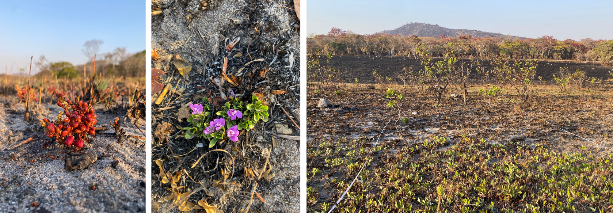 The fire spanned the whole shallow valley side, up to the opposite slope that was no longer flammable after a management burn 2 months ago. This previous burn already had regrowth and we set up vegetation plots out of curiosity to somewhat predict the near future of our transect. We found almost an entirely different species composition and many more flowers blooming - but the stars of the show were the especially well-prepared underground trees.